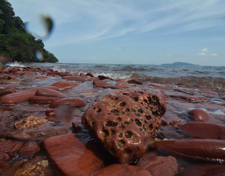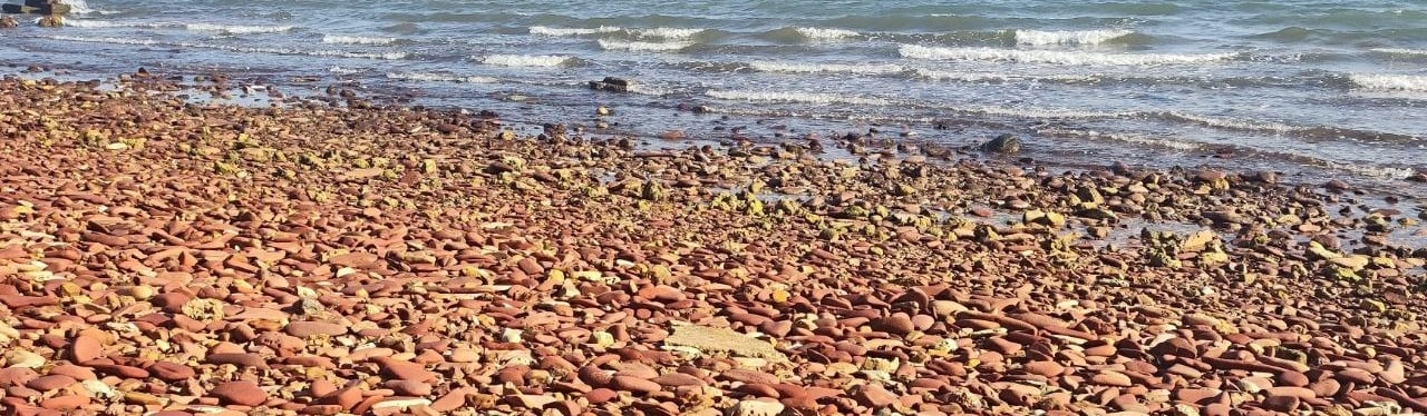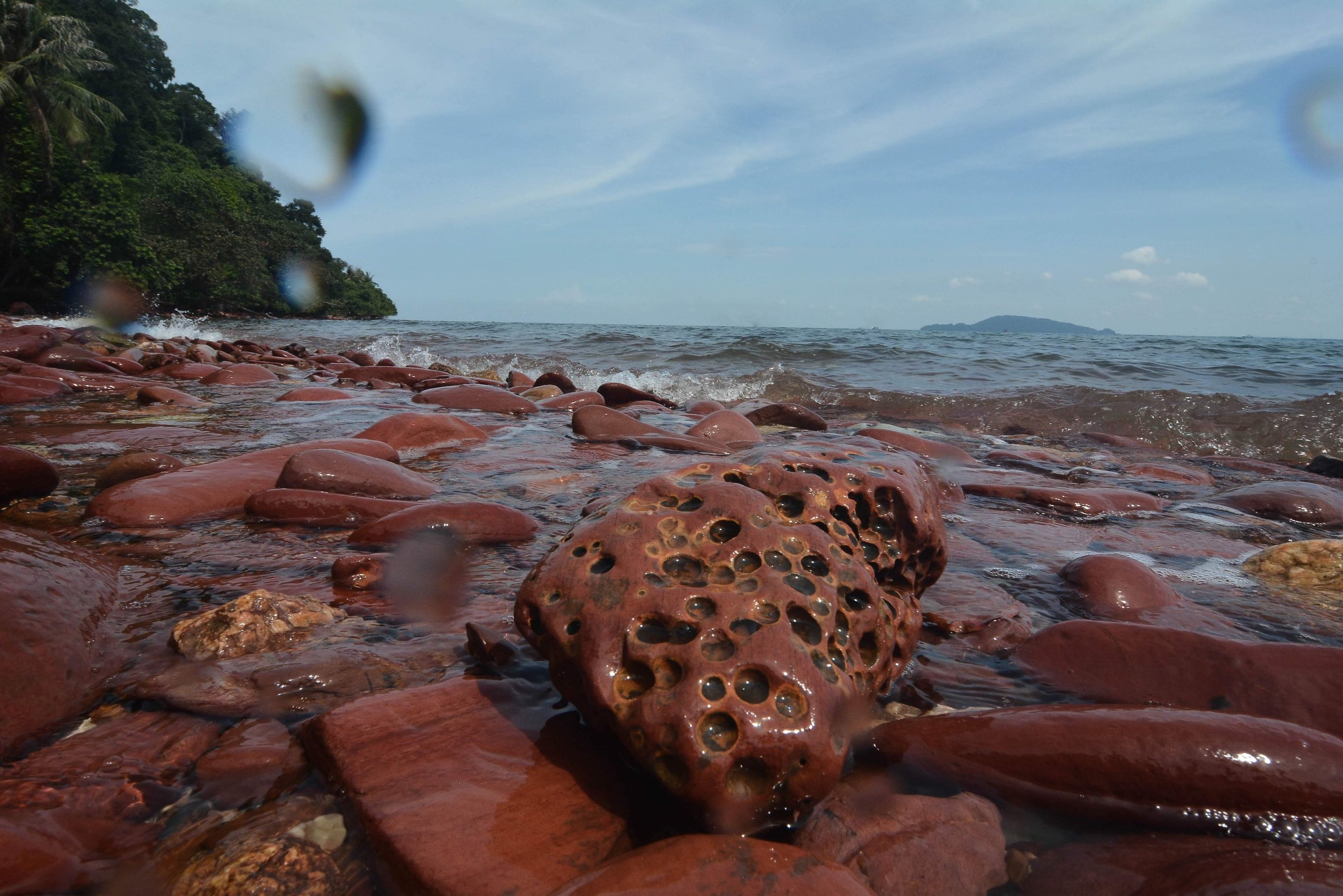 Warna merah pada batuan semula jadi, termasuk yang kelihatan di dalam air, berpunca daripada mineral yang mengandungi besi.